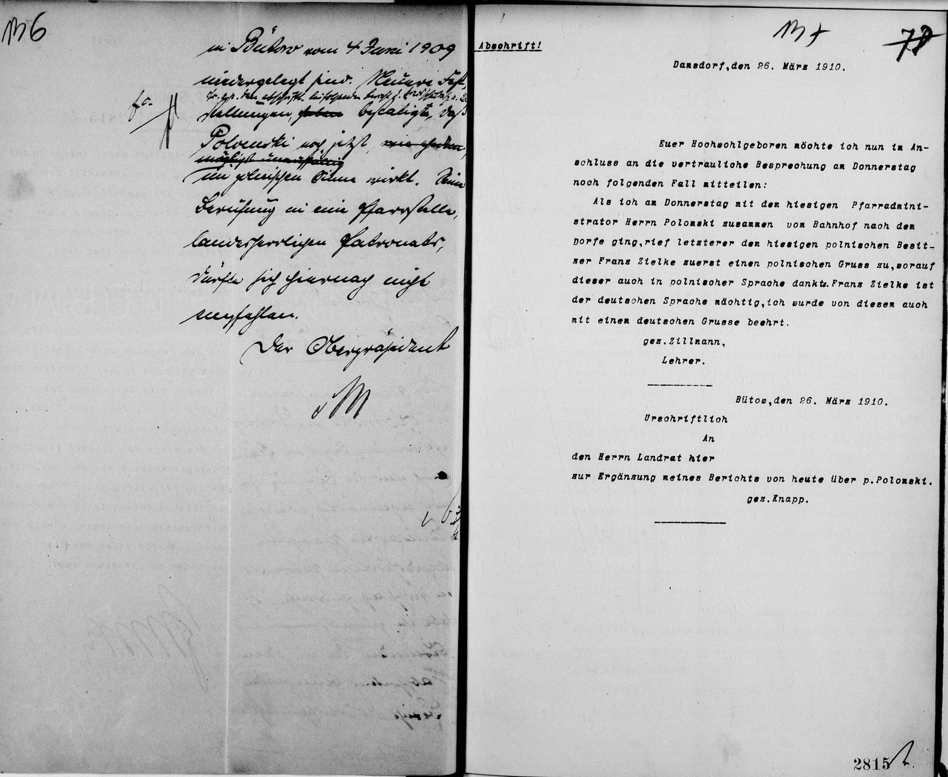 Donos nauczyciela Zillmanna na ks. Połomskiego
